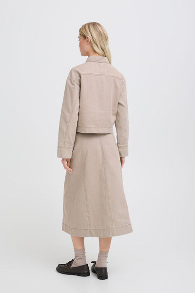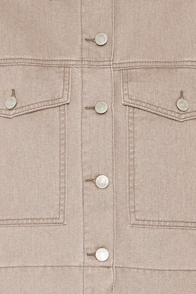 Boxy biker jacket with a button front, drop shoulders and a structured collar. The neutral colour and defined seams add subtle structure. Features two large flap pockets and long straight sleeves for a modern, roomy feel.