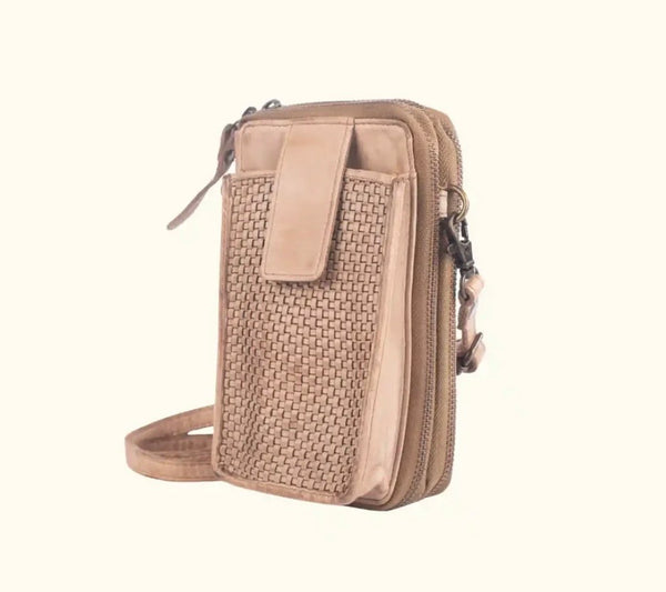 One of our best selling cross body bags cum wallet. Made of washed leather with micro weaving design at the front. This bag is small but mighty, measuring 7” x 4” x 1 1/2” it Consists of an external iPhone pouch with a flap, 12 Credit card slots and ‘3’ pockets, this elegant mini is a great way to stay organized and sylish.