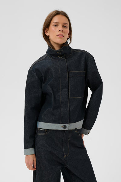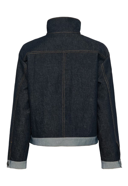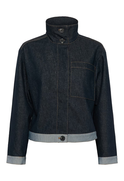 A stylish Denim jacket with a loose fit, high stand collar and button front closure with contrast front panel features large chest pockets  and buttoned cuffs. Cropped boxy silhouette with striking contrast detail for a modern interpretation!.