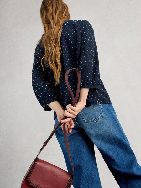 A flattering V-neck. Sleeves with slight volume. And a soft 100% organic cotton fabric. This is Ruby and we think you'll get along just fine.