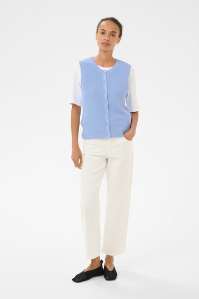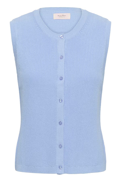 This knitted vest is designed with a round neckline, button closure, and a fine ribbed structure. The soft, lightweight quality ensures a comfortable fit and a clean look. Style it over a T-shirt or wear it alone with trousers for an easy everyday outfit.