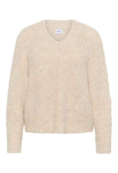 Beige knitted sweater with V-neck and long sleeves. Slightly loose fit with textured knit and cable detail on the sleeves. Soft and warm fabric. The model is 179 cm tall and is wearing a size S.