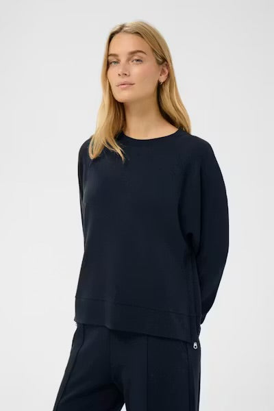 This dark navy sweatshirt in a soft cotton blend features a relaxed fit with a round neckline and side zips for a modern touch. The double hemline adds a laid-back feel – perfect for lounging or everyday wear with matching trousers or jeans.